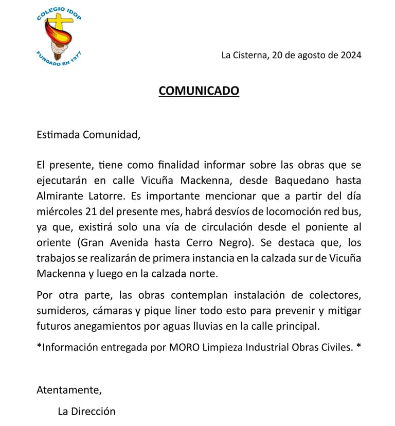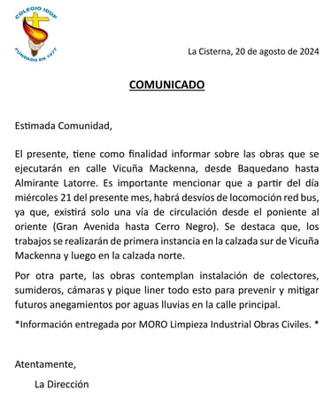 Comunicado Informativo trabajos de mejoramiento